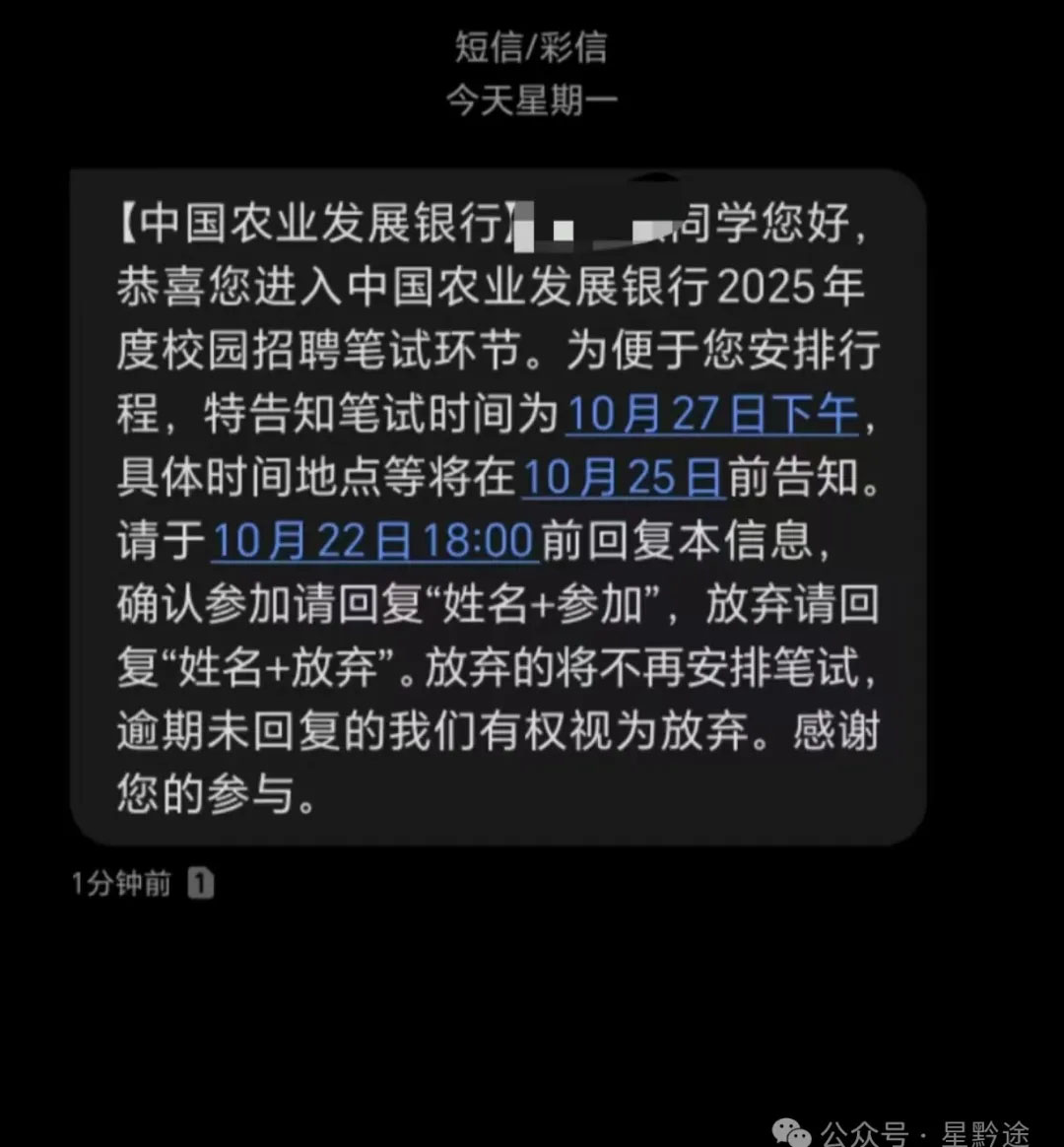 【中国农业发展银行】同学您好,恭喜您进入中国农业发展银行2025年度校园招聘笔试环节。为便于您安排行程,特告知笔试时间为10月27日下午,具体时间地点等将在10月25日前告知。请于10月22日18:00前回复本信息,确认参加请回复“姓名+参加”,放弃请回复“姓名+放弃”。放弃的将不再安排笔试,逾期未回复的我们有权视为放弃。感谢您的参与。