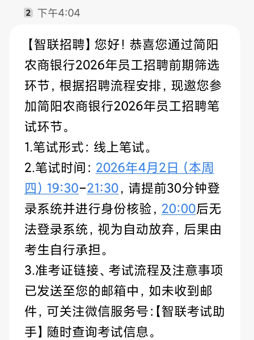 笔试时间:2026年4月2号(本周四)19:30-21:30